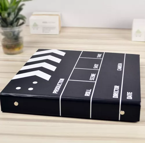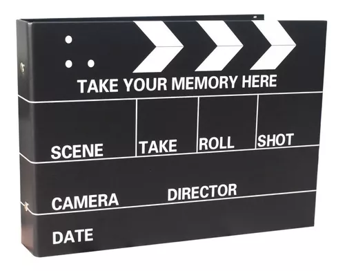 Álbum de fotos con diseño de claqueta de cine.