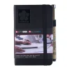 Este cuaderno para bocetos de tapa dura incorpora un soporte para bolígrafo y un Pigma Micron negro. La banda de cierre elástica garantiza que el libro permanezca cerrado y compacto mientras viajas.